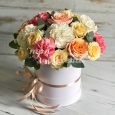 Шляпная коробка роз, эустом и гортензии